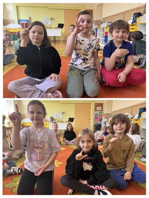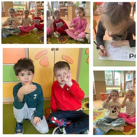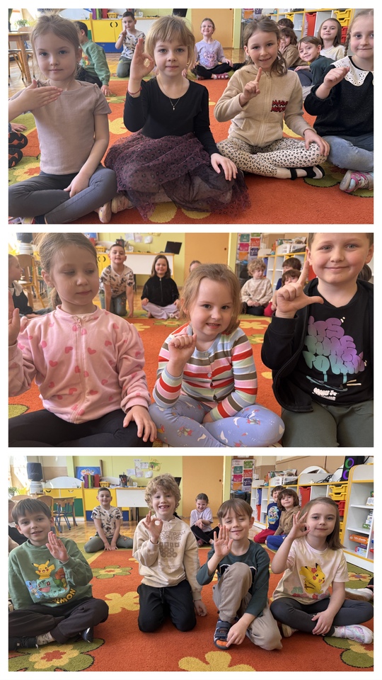 w parach o tym, co lubią i co kochają, ucząc się jednocześnie pokazywać w języku migowym znaki „lubić” i „kochać”. Przedszkolaki utrwalały poznane zwroty grzecznościowe, takie jak: „dziękuję”, „proszę” i „przepraszam”, wykorzystując je podczas zabawy z „wierszem grzecznościowym”.