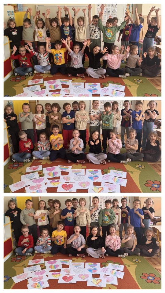 Dzieci z grupy II i VI zrealizowały zadanie nr 3. Podczas zajęć poznały nową piosenkę na powitanie pt. „ Dzień dobry, witam Cię” oraz „Zapraszam na zajęcia”. Pokolorowały serca oraz rozmawiały