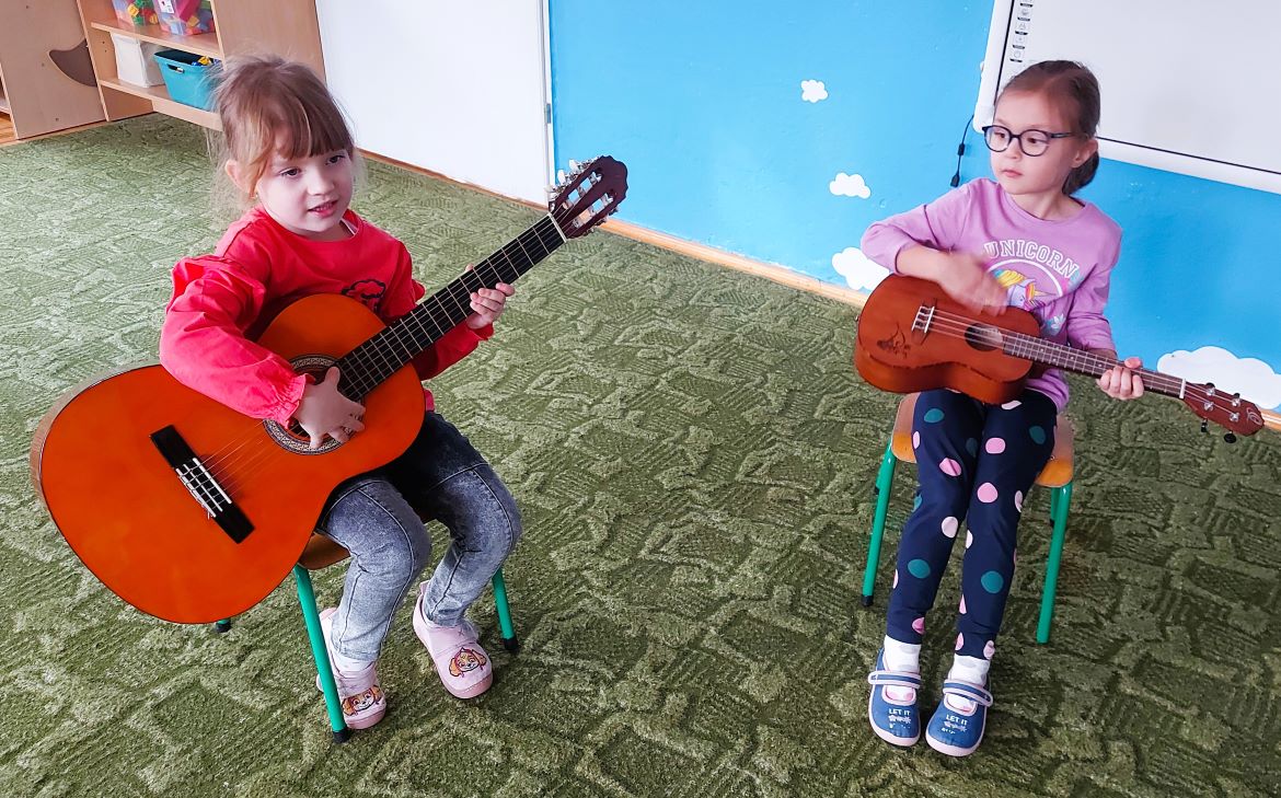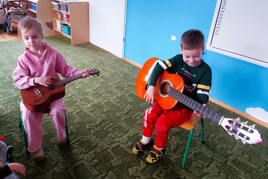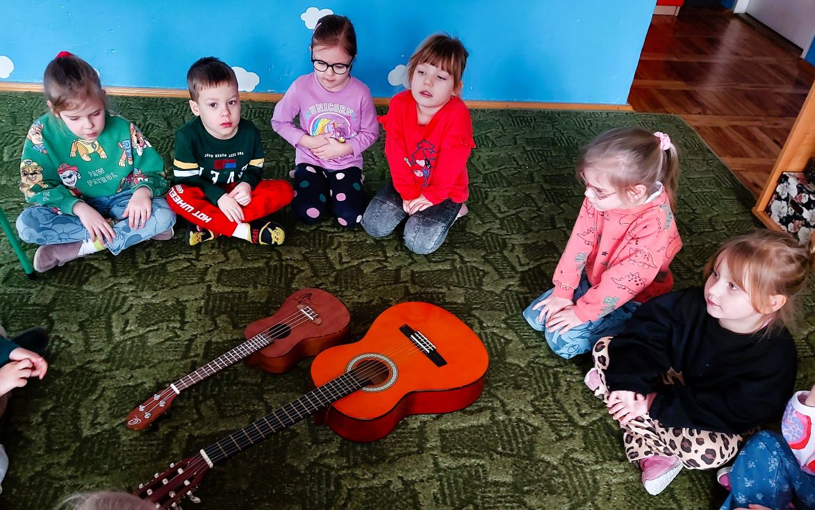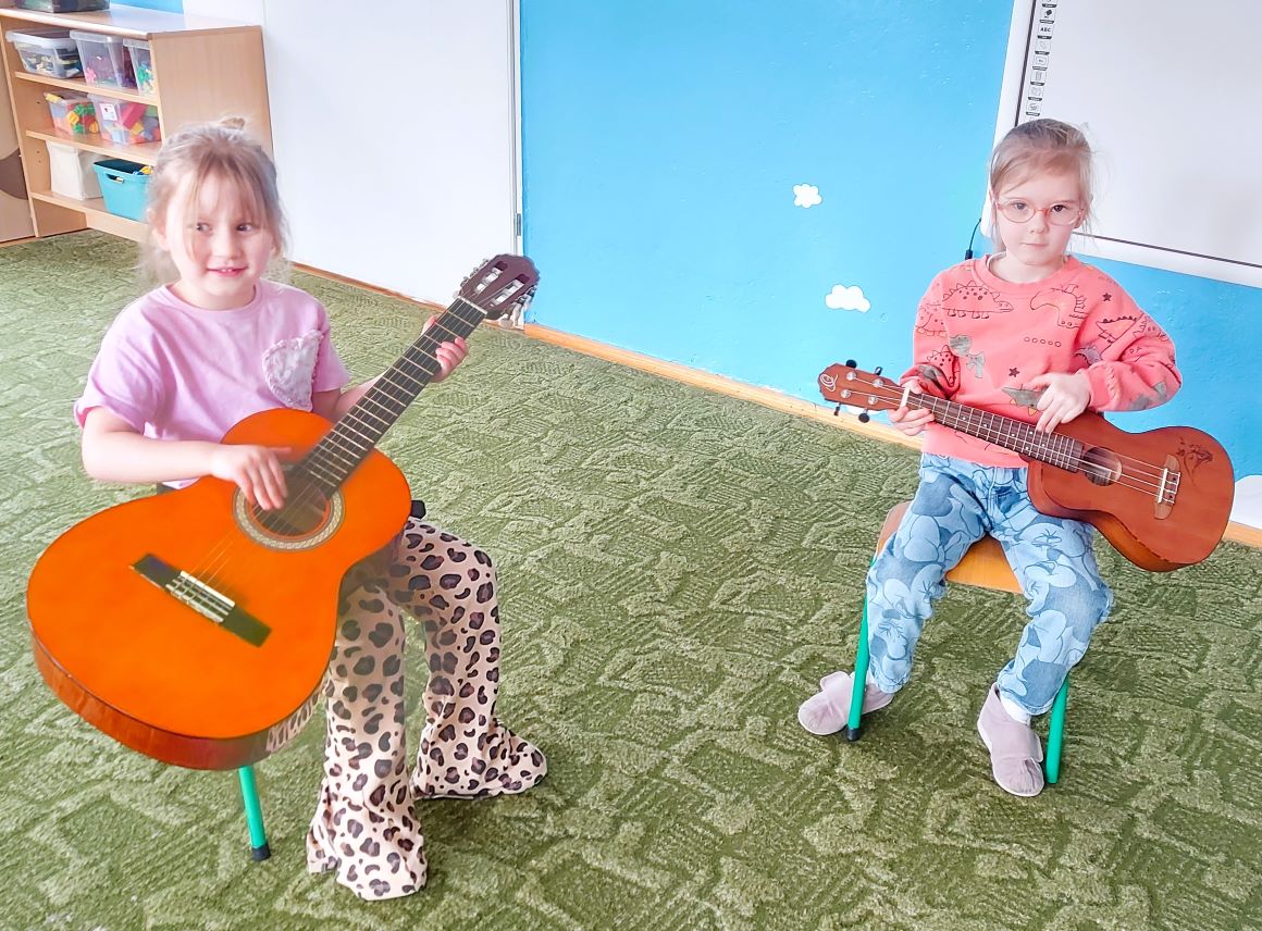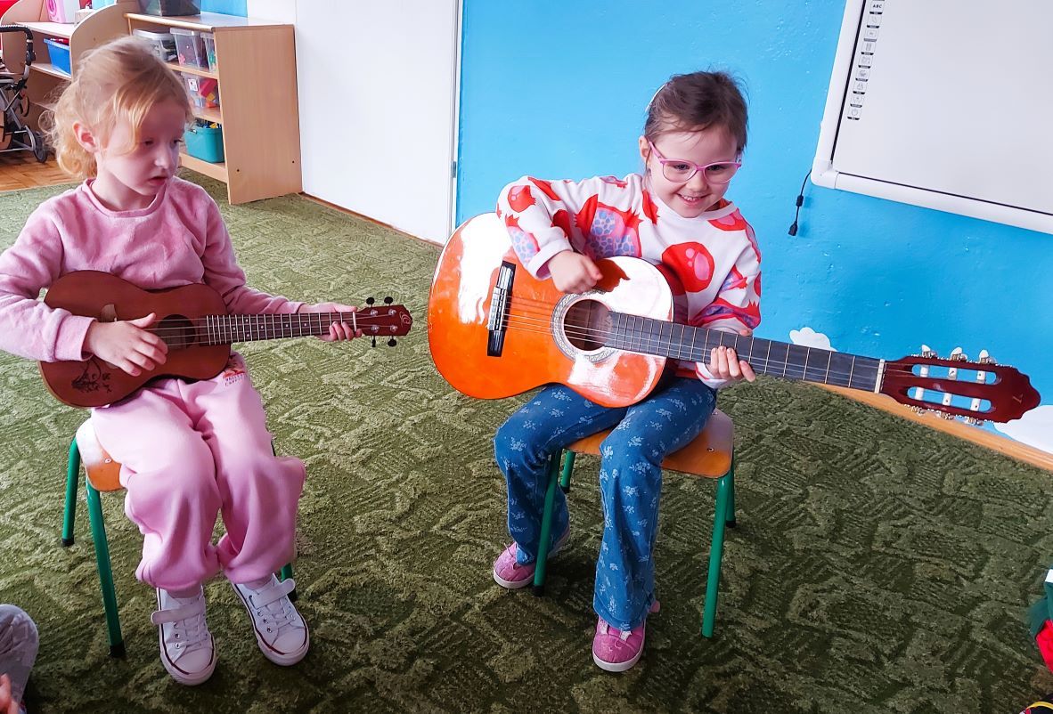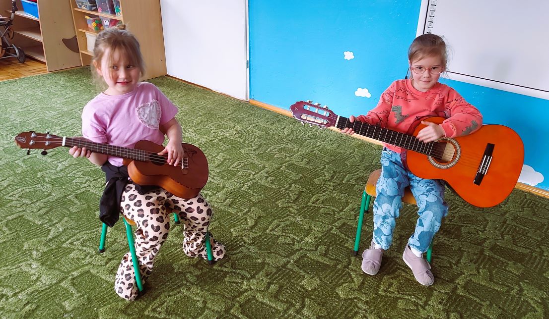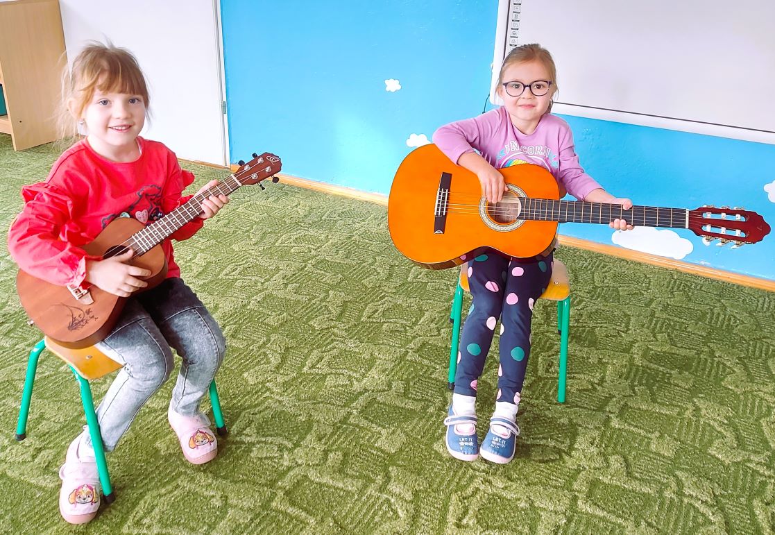 Dzieci z grupy I poznały wygląd, budowę, sposób wydobywania dźwięku oraz brzmienie gitary i ukulele. Było to pełne radości spotkanie z muzyką.