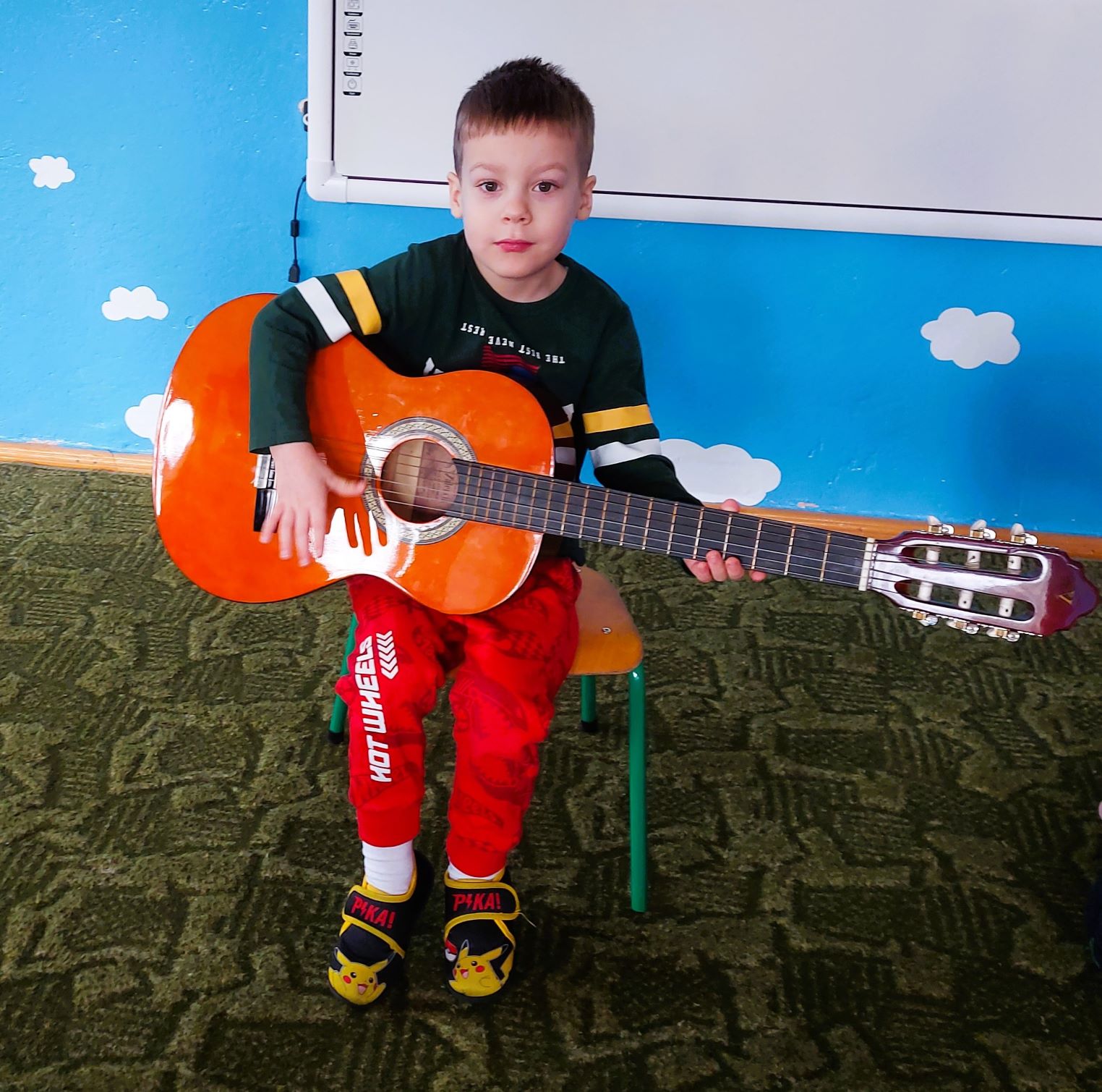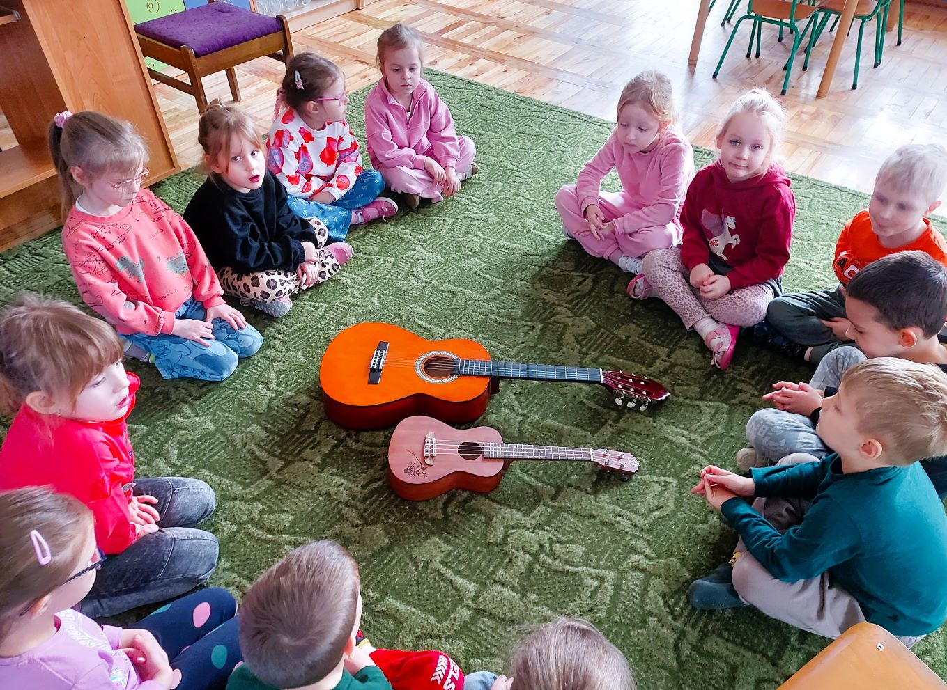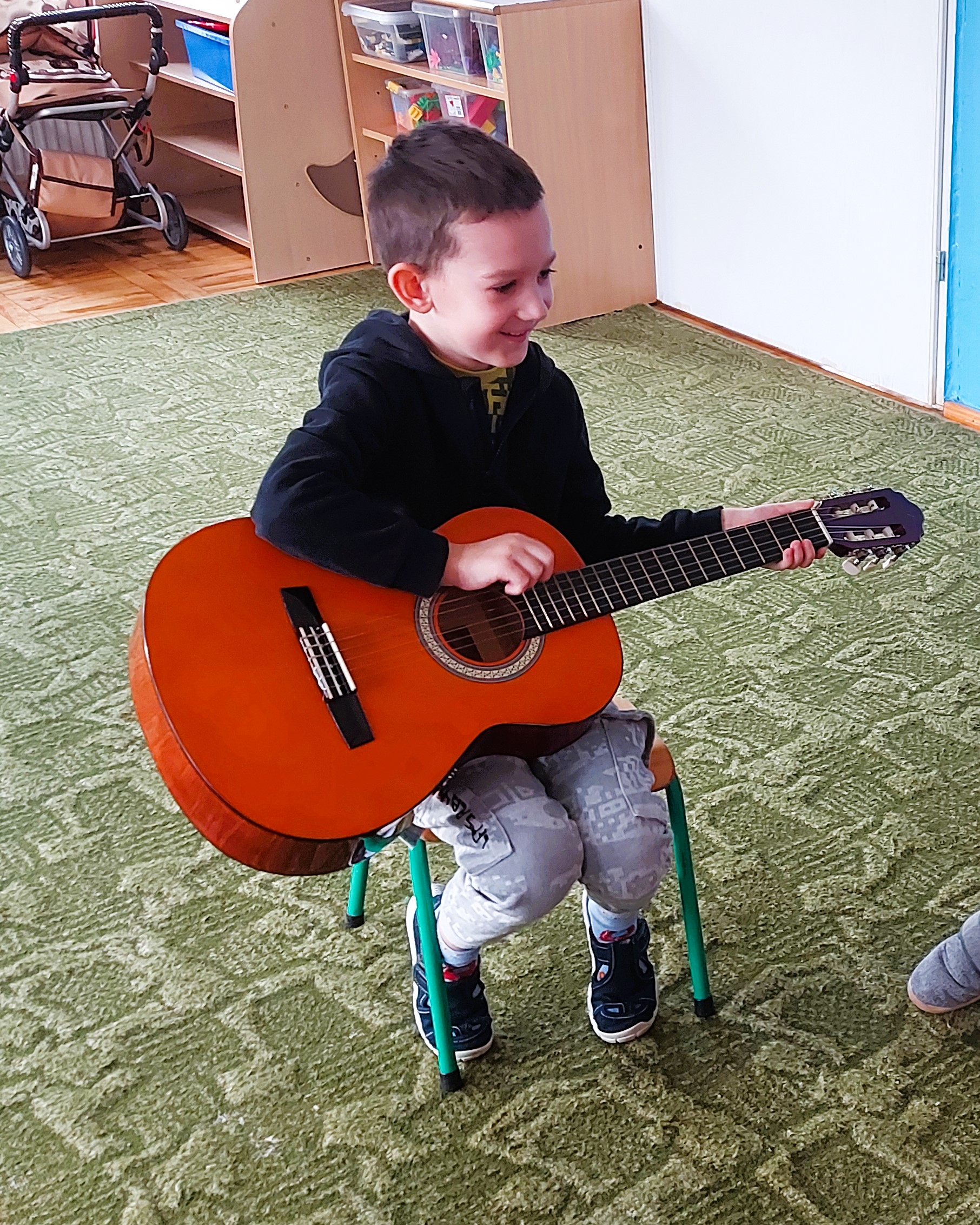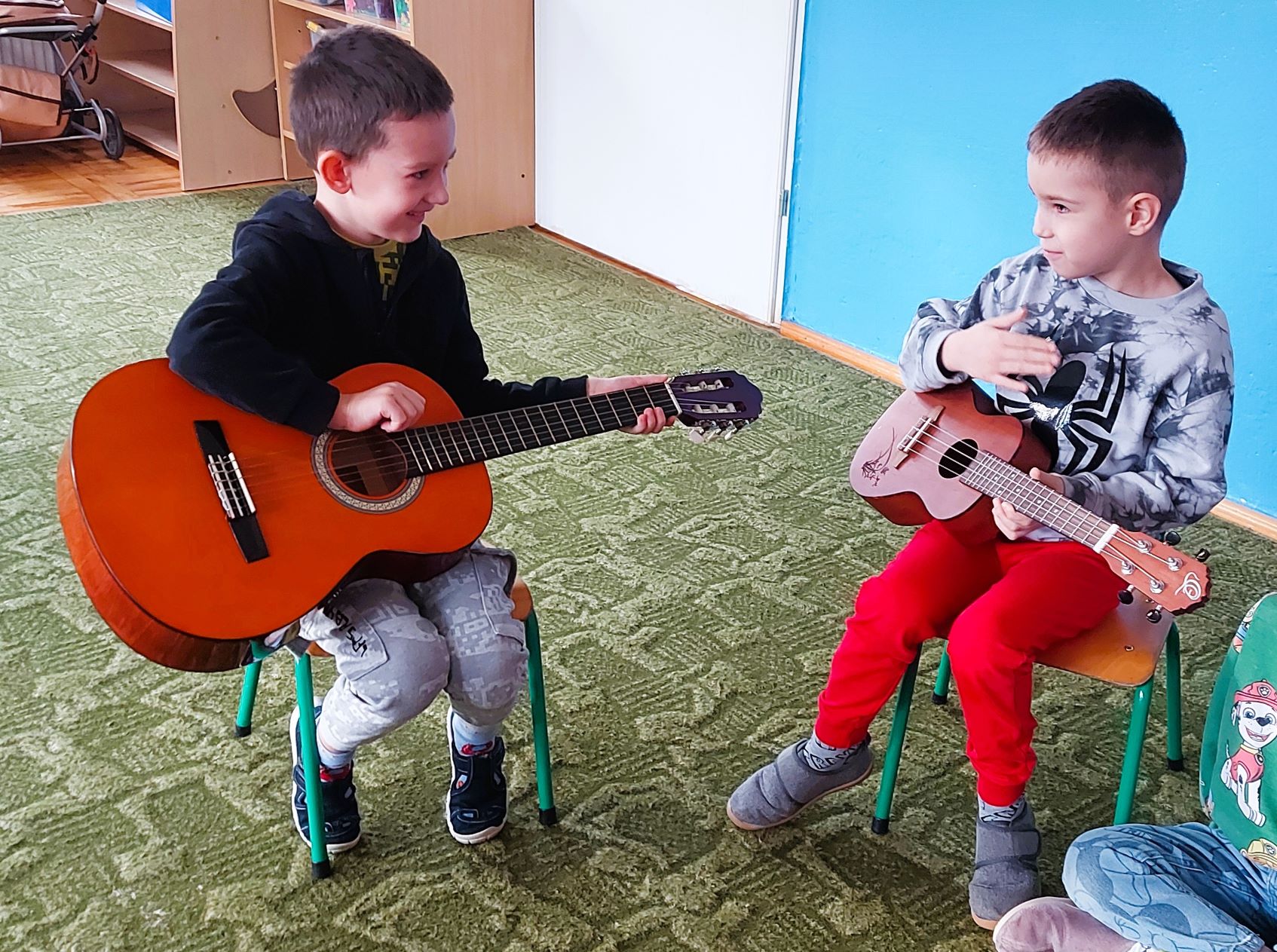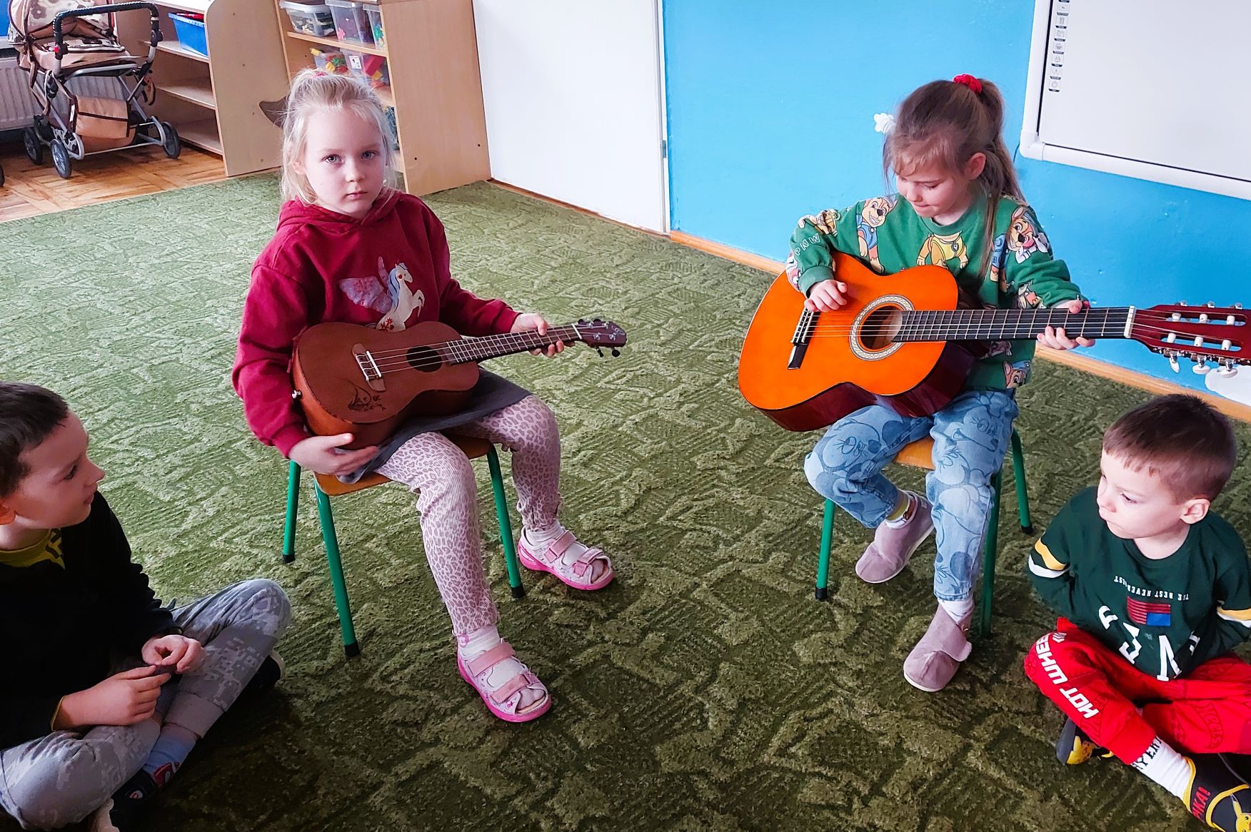 Dzieci z grupy I poznały wygląd, budowę, sposób wydobywania dźwięku oraz brzmienie gitary i ukulele. Było to pełne radości spotkanie z muzyką.