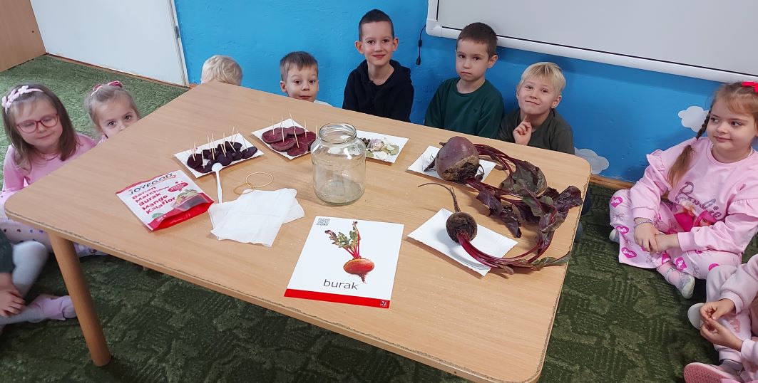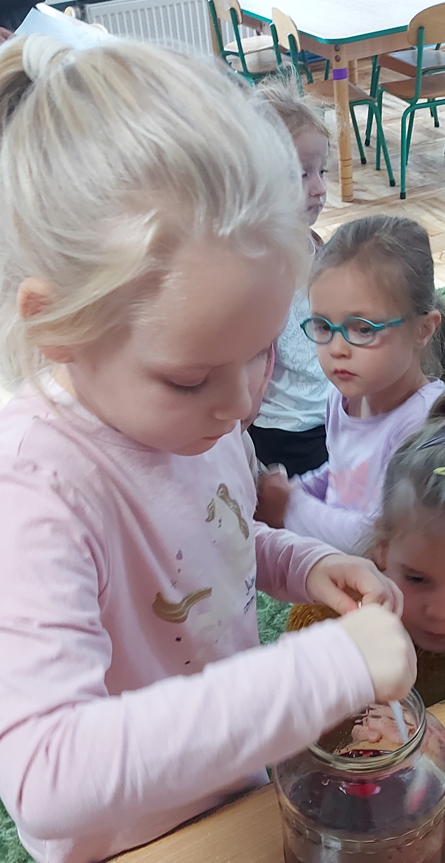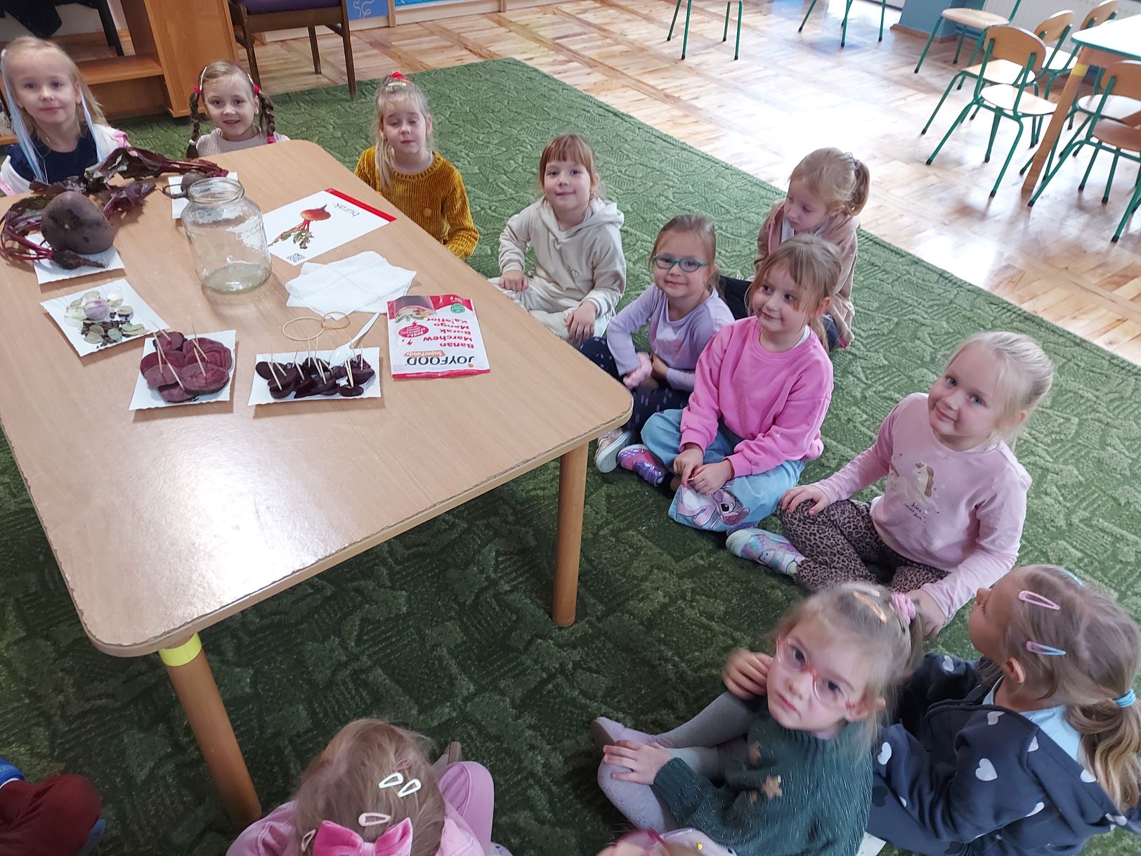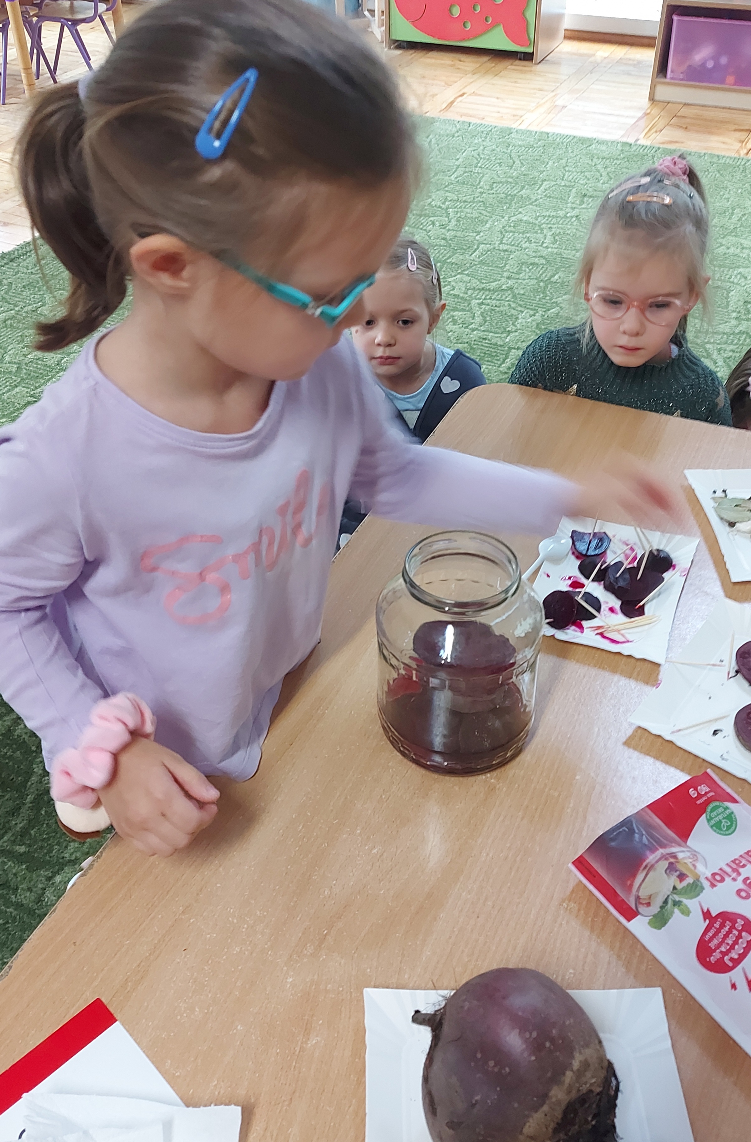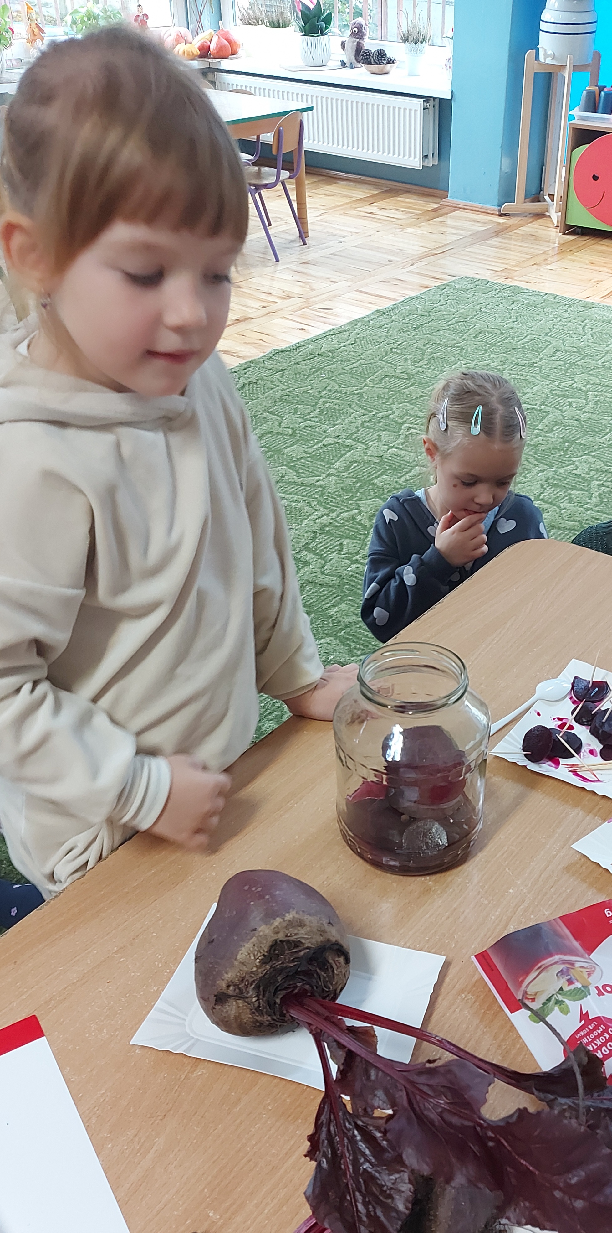 Przedszkolaki w ramach działań związanych z promocją zdrowia w naszym przedszkolu przygotowały bogaty w witaminy i bardzo zdrowy zakwas buraczany.