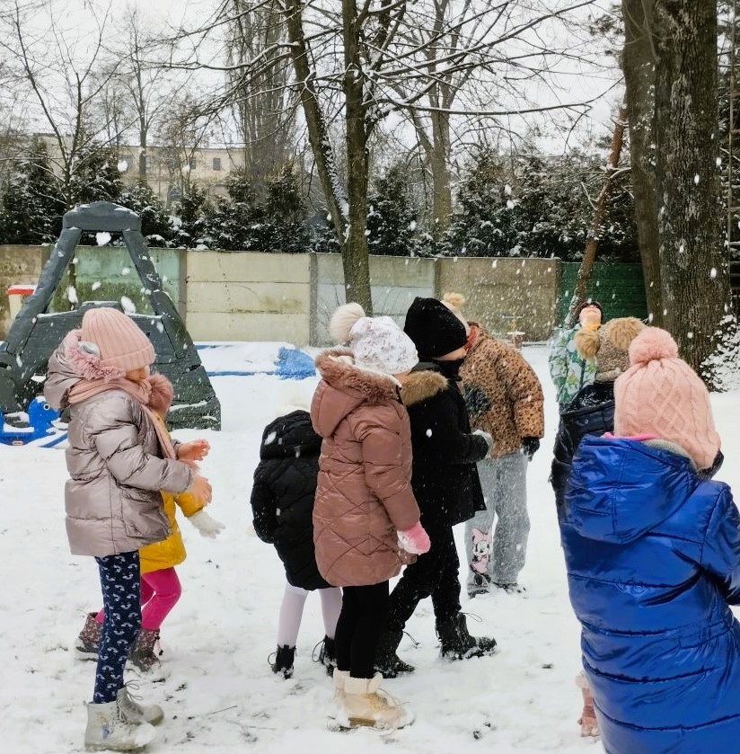 Zimowe zabawy na śniegu w ogrodzie przedszkolnym.